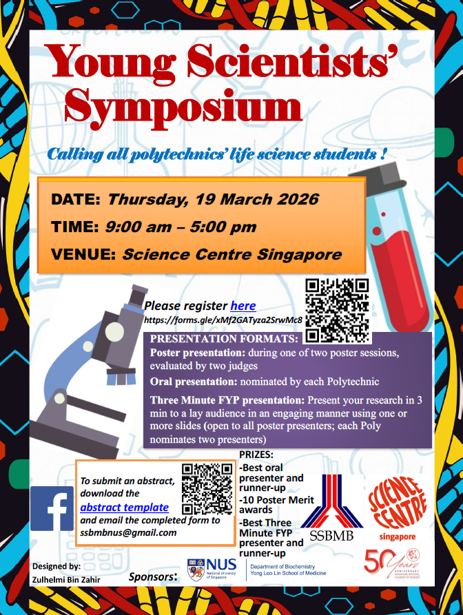 Young Scientist Symposium 2026 is an annual event co-organised by the SSBMB, Science Centre Singapore and sponsored by the Department of Biochemistry, NUS Medicine. It celebrates the gaining of scientific knowledge, experience, independence, and other research skills through a research symposium presented by Polytechnic students in Singapore.